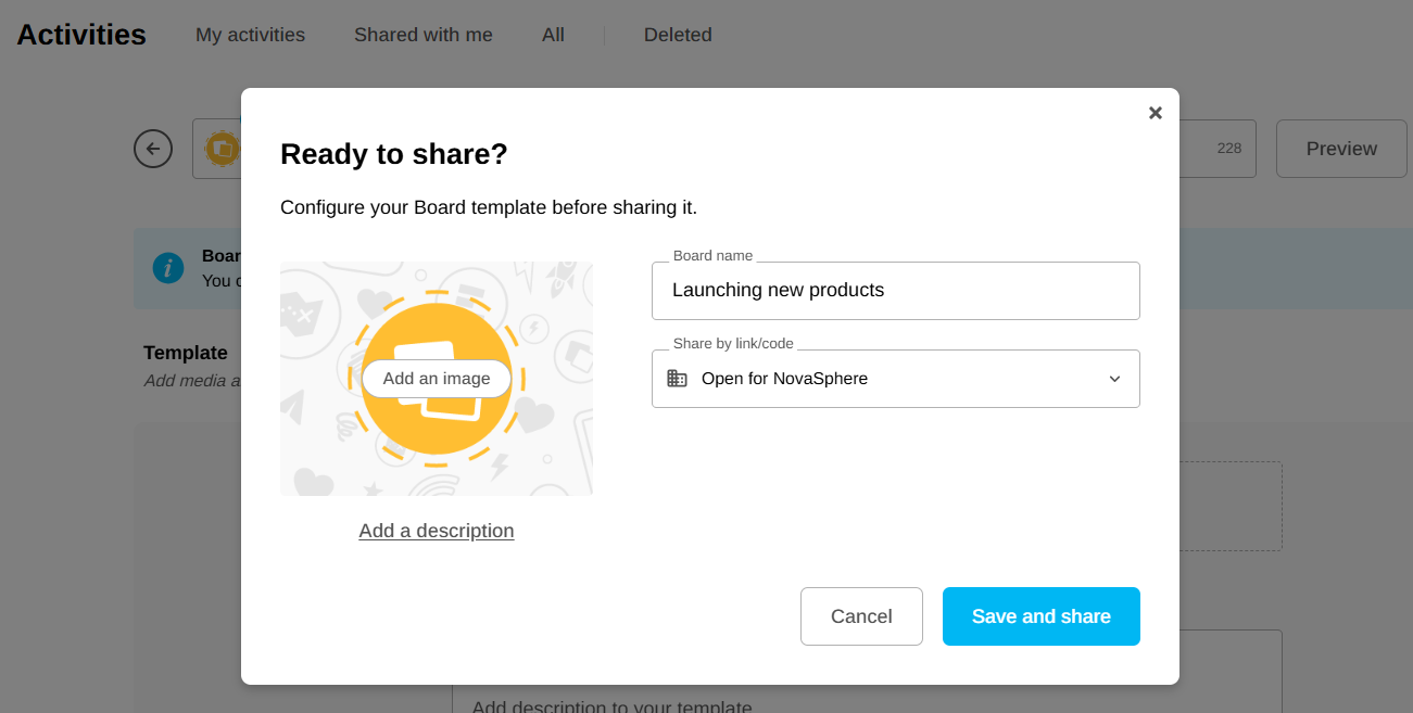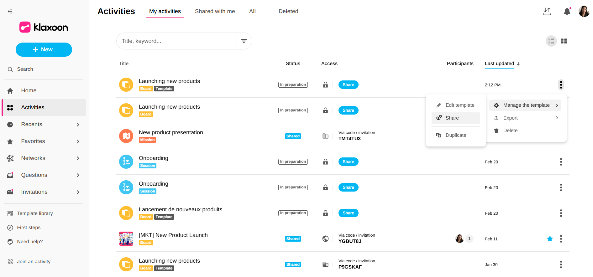 From your Activities page, click on the “3 dots” menu at the end of the Template you wish to share. Then drag your mouse cursor over “Manage activity” and click on “Share”.