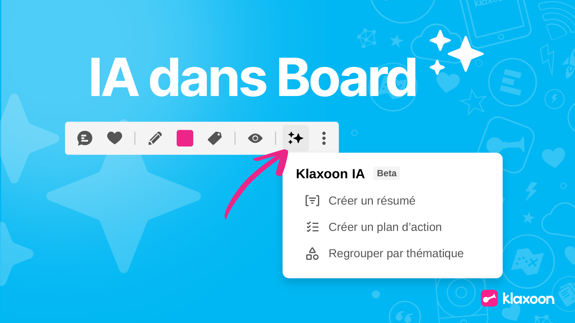 L'intelligence artificielle s'apprĂȘte Ă transformer votre expĂ©rience de Board avec le lancement de trois nouvelles fonctionnalitĂ©s : crĂ©er un rĂ©sumĂ©, crĂ©er un plan d'action et regrouper par thĂ©matiques. L'IA dans Board est une option activable par l'administrateur des licences Klaxoon, pensĂ©e pour vous permettre de vous concentrer sur vos tĂąches Ă forte valeur ajoutĂ©e.