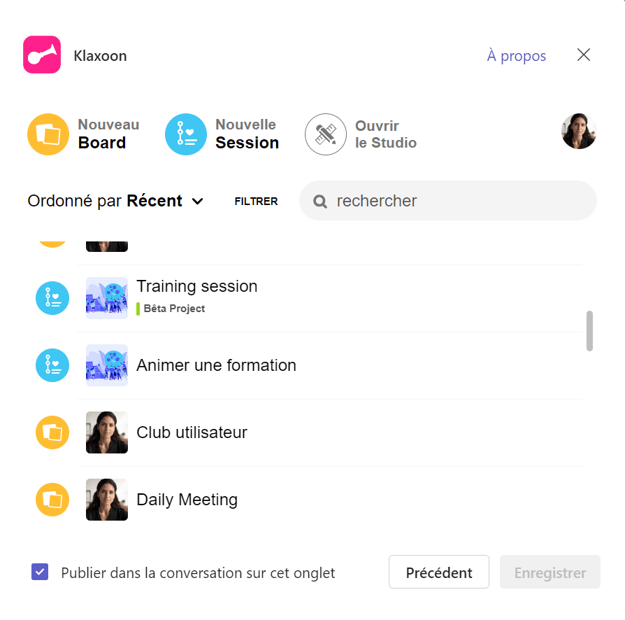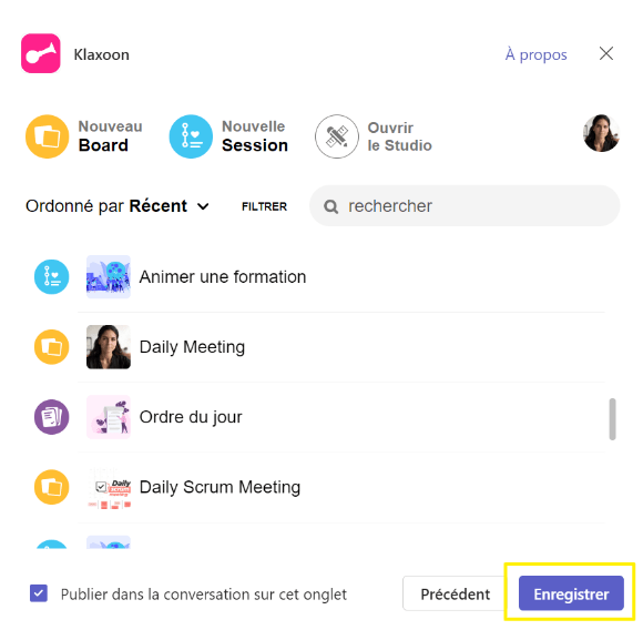 Vous pourrez soit écrire le nom Klaxoon, soit la retrouver dans la liste déroulante si vous l'avez déjà utilisée