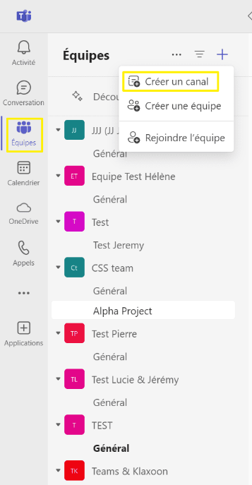Pour cela, depuis l'icône "Equipe" sur Teams, cliquez sur le "" pour créer un canal.
