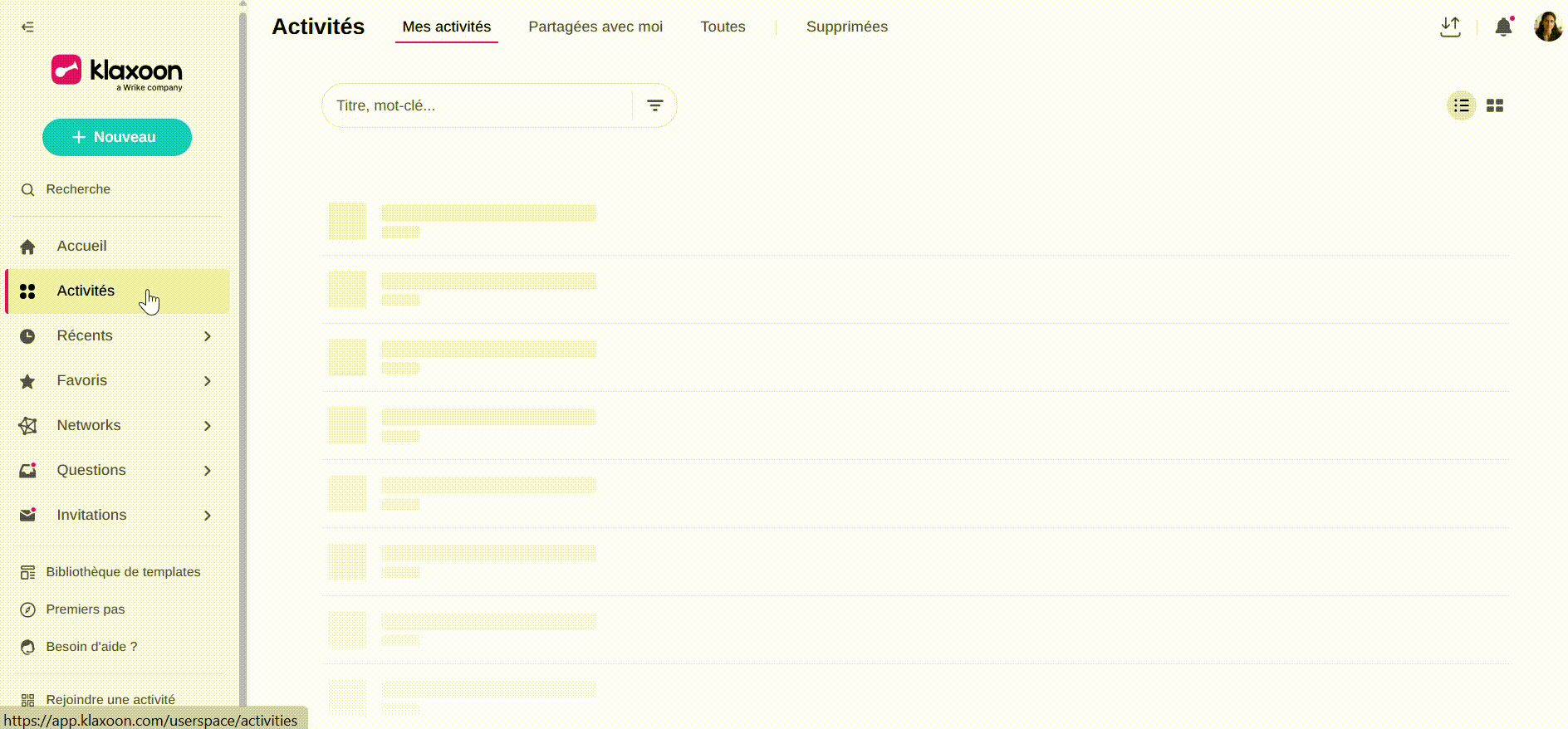 Dans l'onglet "Activités", vous pouvez exporter vos activités sous forme de fichiers KLX qui peuvent ensuite être réimportés dans un autre compte Klaxoon.