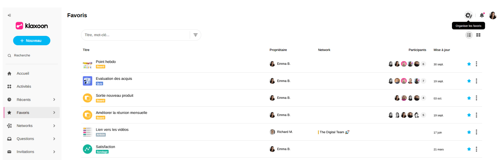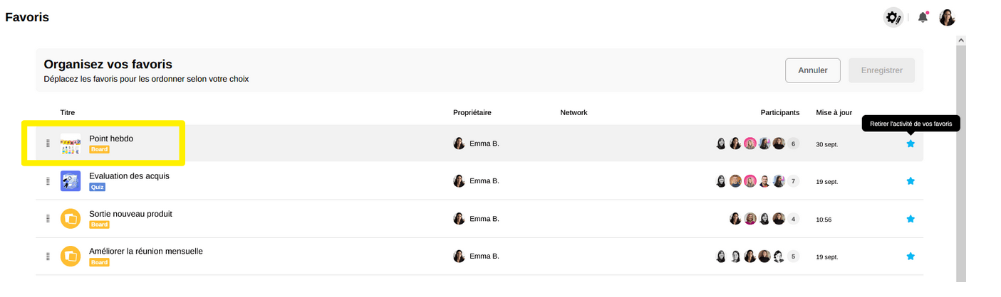 Grâce à l'étoile sur le côté de l'activité, vous allez pouvoir "Retirer l'activité de vos favoris".