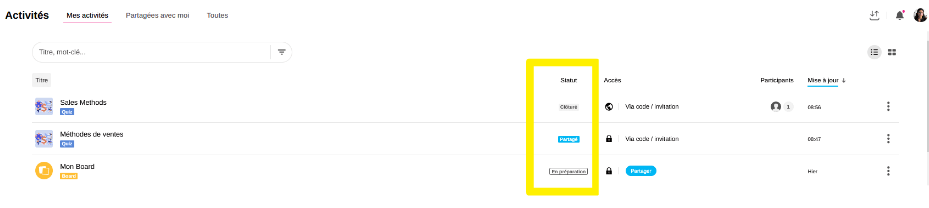 Depuis l'onglet "Activités" dans la barre de navigation de gauche, trois étiquettes de statut sont attribuées à vos activités :