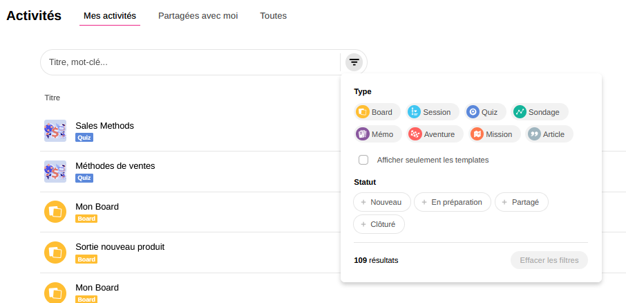 Pensez à utiliser le filtre pour gérer facilement vos activités et les trier par statut ou type