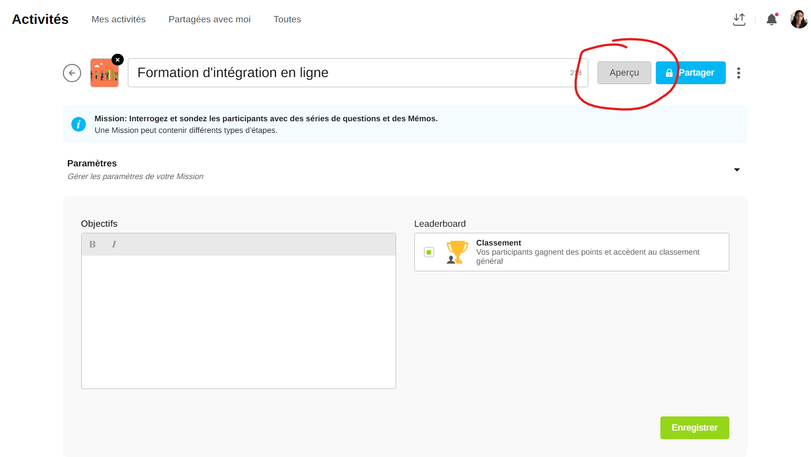L'aperçu vous permet de prévisualiser une activité avant de la lancer. Vous pouvez voir ce qui apparaîtra sur l'écran des participants à l'activité.