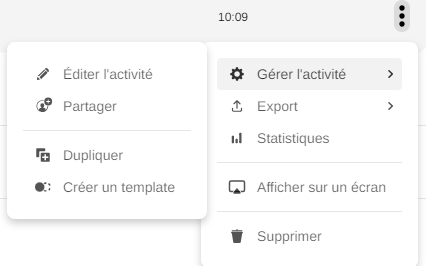 Depuis l'onglet activités de la page d'accueil, cliquez sur les trois points verticaux sur la ligne de l'activité que vous souhaitez réutiliser et sélectionnez Gérer l'activité puis Dupliquer. Vous obtenez ainsi une nouvelle version identique de l'activité que vous pouvez modifier et compléter à votre guise.