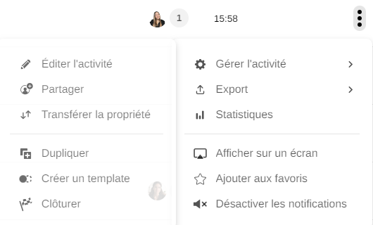 Cliquez ici pour afficher un menu contextuel (les options disponibles dépendent de l’état de l’activité) :
