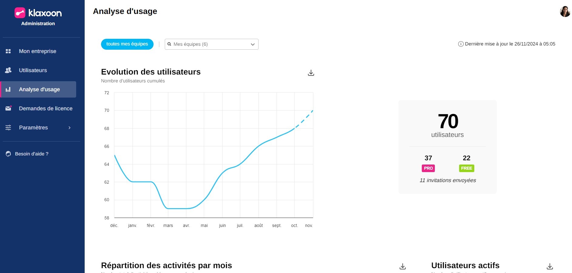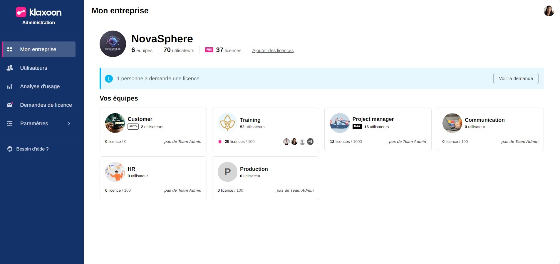 Pour revenir au niveau administrateur de l'entreprise, fermez tout simplement la fenêtre de l’administration d’équipe qui s’était ouverte. Vous pouvez également cliquer sur votre photo de profil Klaxoon, puis cliquer sur “Administration”.
