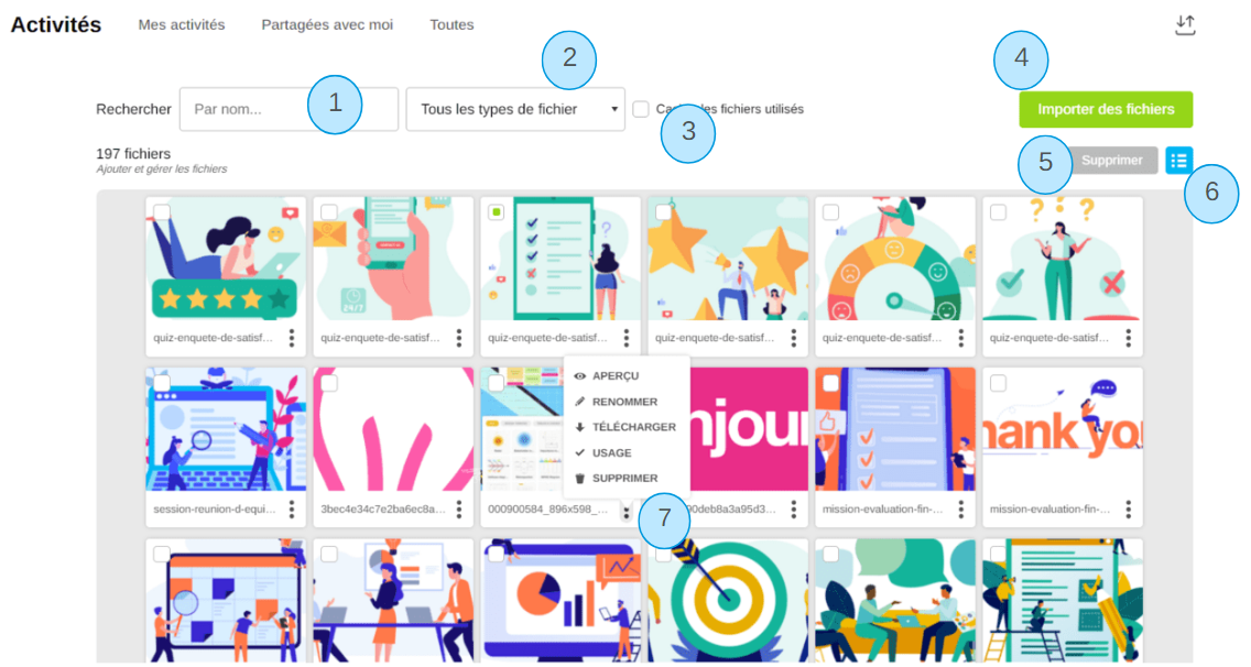 3) Cacher les fichiers utilisés : Cochez pour que la liste contienne uniquement les fichiers qui ne sont utilisés dans aucune activité (par exemple, pour les supprimer et libérer rapidement de l'espace de stockage).