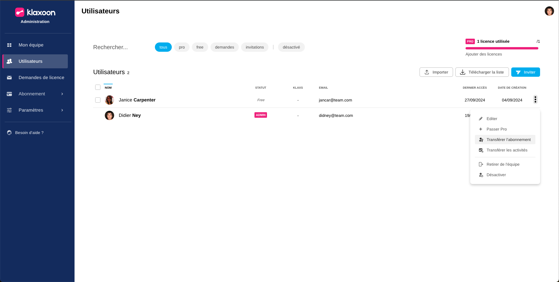 Sélectionnez le menu « 3 points » à droite de l'utilisateur pour transférer l'abonnement.