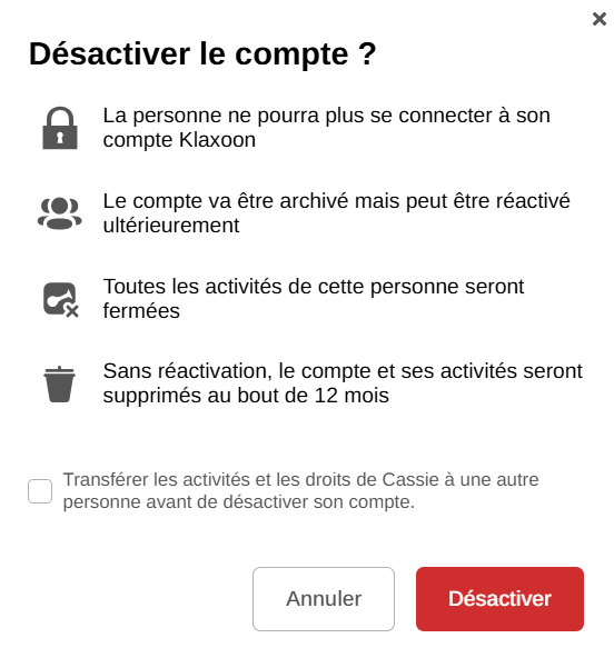 l'utilisateur ne pourra plus se connecter à son compte Klaxoon