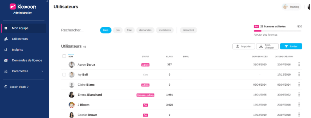Connectez-vous à votre compte Klaxoon, puis cliquez sur votre photo de profil en haut à droite de l'écran. Dans le menu déroulant, sélectionnez "Administration" pour accéder à l'interface d'administration.
