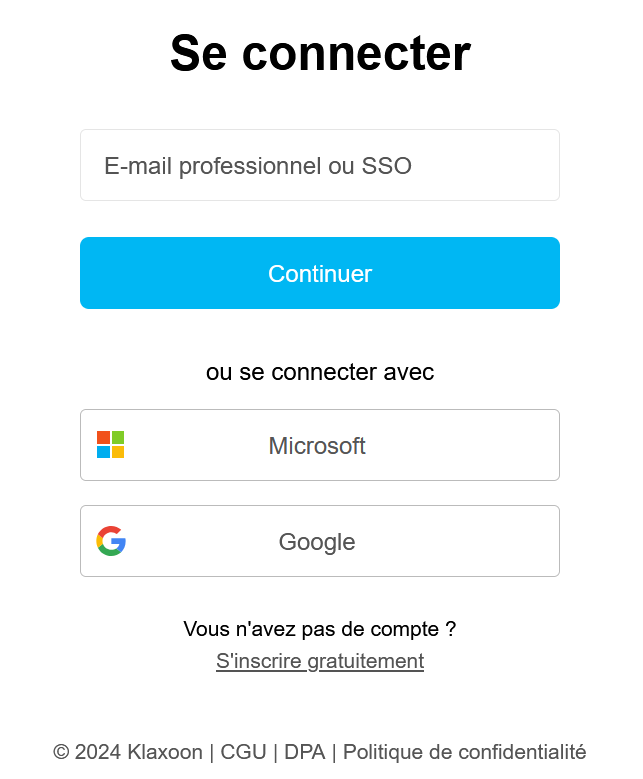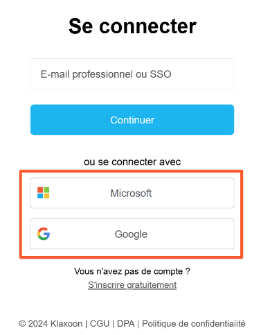 La connexion SSO publique via des plateformes telles que Google ou Microsoft permet aux utilisateurs de se connecter à Klaxoon en utilisant les mêmes identifiants de connexion qu’ils utilisent pour leur compte sur ces plateformes.