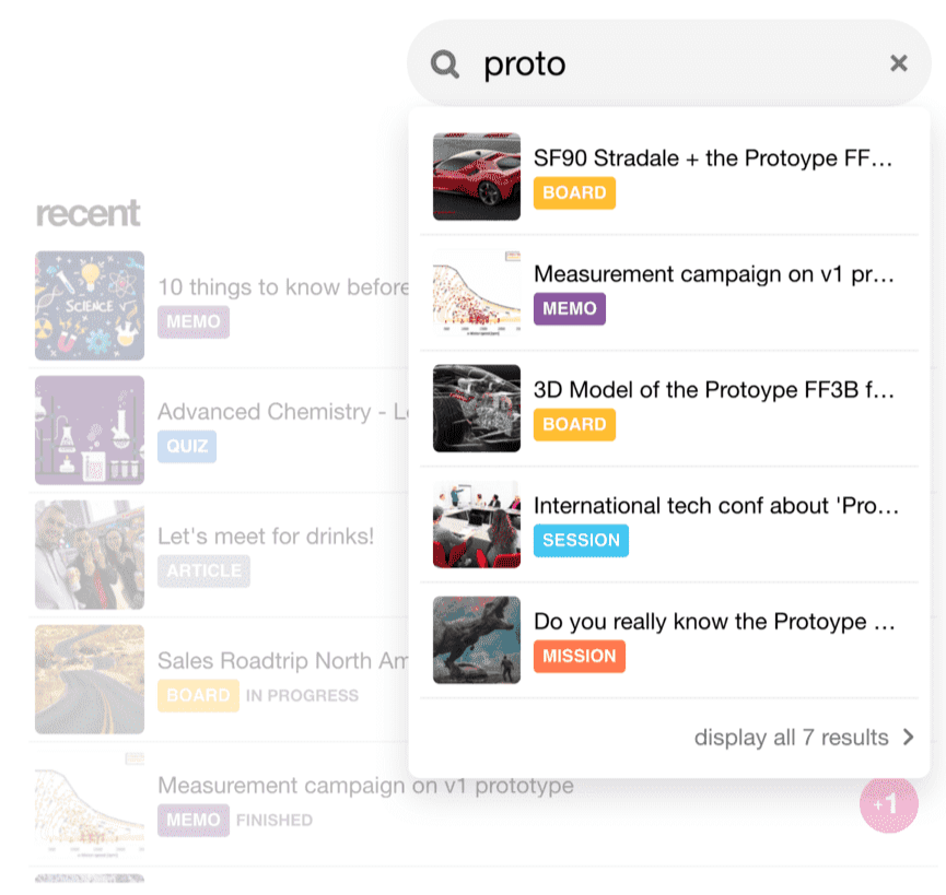 Un nouvel algorithme rend la recherche plus pertinente pour vous assurer une utilisation de Klaxoon toujours plus performante. Les résultats sont affichés en fonction de leur date de consultation, du plus récent au plus ancien. La recherche partielle devient également possible.