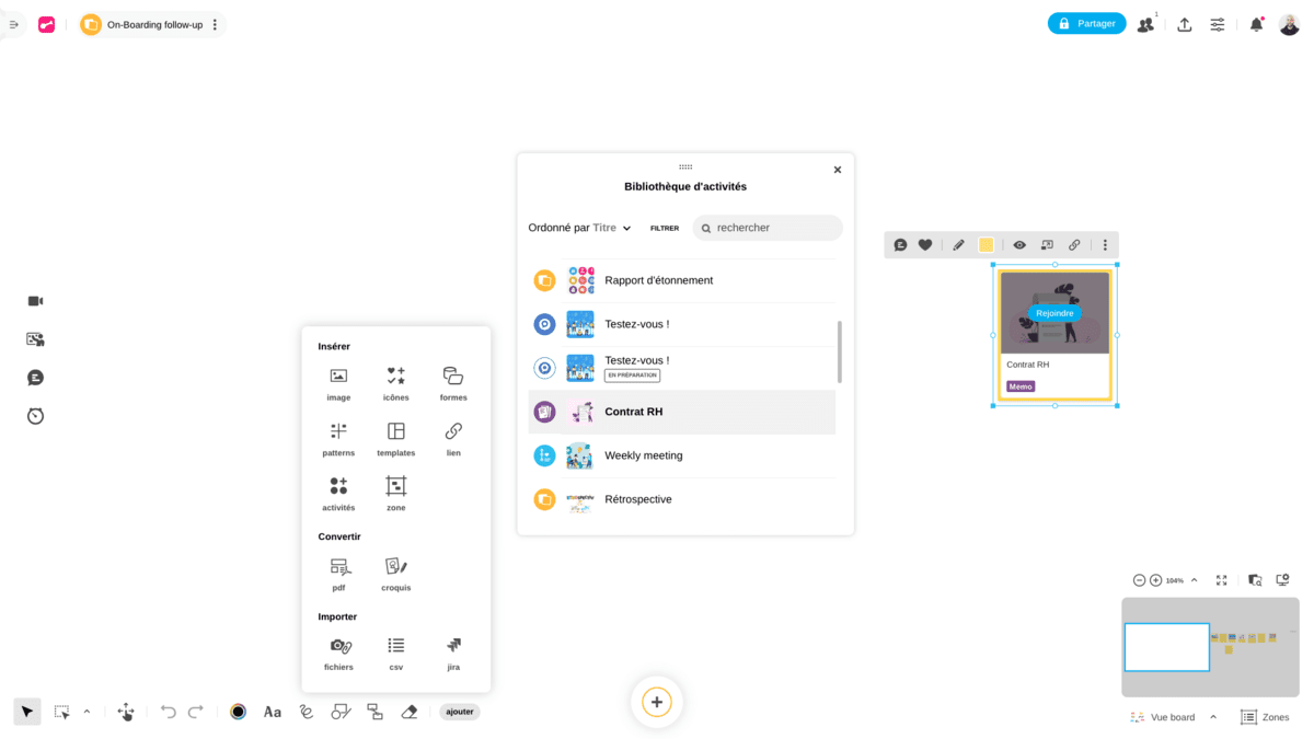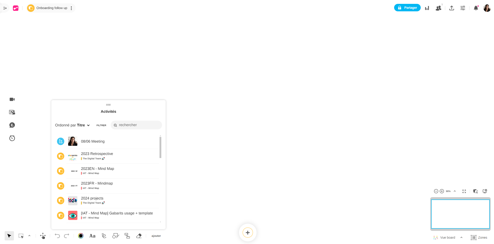 Lorsque vous êtes sur votre Board, en bas à gauche de votre écran vous verrez la barre d'outil. Cliquez sur "Ajouter" puis dans l'onglet cliquez sur "activités". Une nouvelle fenêtre s'ouvre, il s'agit de la bibliothèque d'activités que vous avez créées ou auxquelles vous avez participé, vous pouvez maintenant choisir là ou les activité(s) que vous souhaitez déposer sur votre Board.