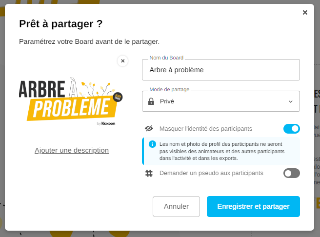 Pour activer ce paramètre, lors du partage de votre activité, cochez l'option "masquer l'identité des participants", une infobulle apparaîtra pour expliquer ce paramètre. Lors de la connexion à l'activité une pop-up apparait pour avertir le participant que celle-ci sera en mode anonyme.