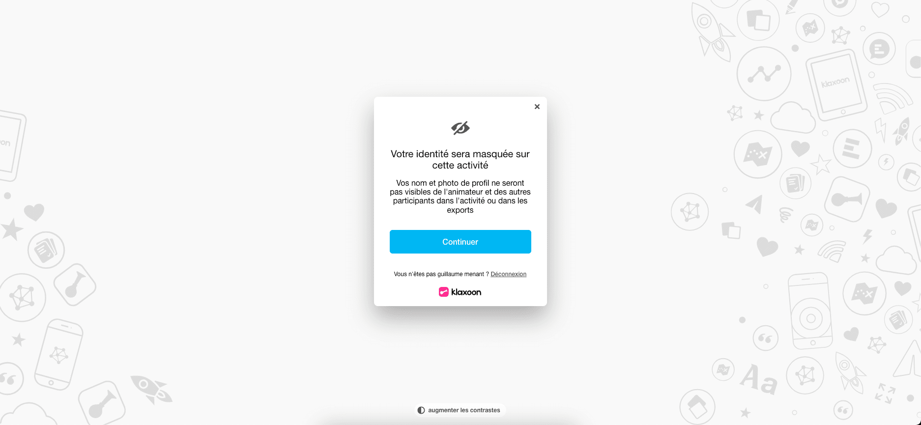 Grâce à cette nouvelle fonctionnalité, nous vous offrons une solution répondant à vos besoins de garantir l'anonymat de vos utilisateurs. Cela permet aussi de garder l'étape de connexion de l'utilisateur à son compte Klaxoon, pour pouvoir éditer les réponses, et conserver l'historique de réponse à l'activité.