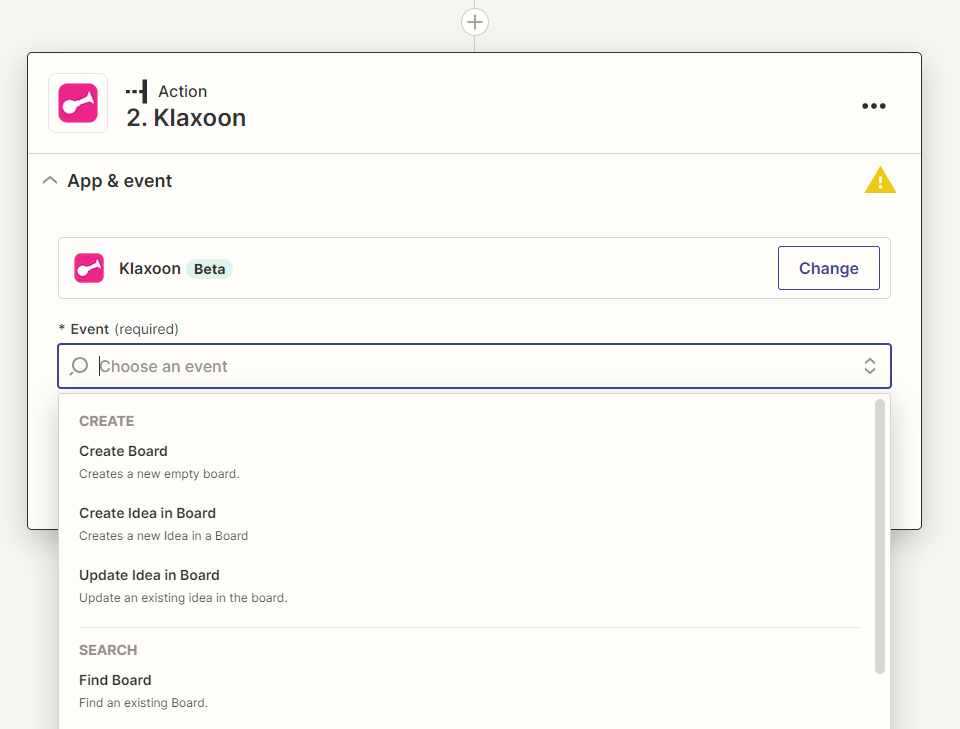 Il vous faut ensuite définir votre "Trigger" : l'application que vous souhaitez connecter à Klaxoon, et l'évènement de cette application qui déclenchera une action dans Board.