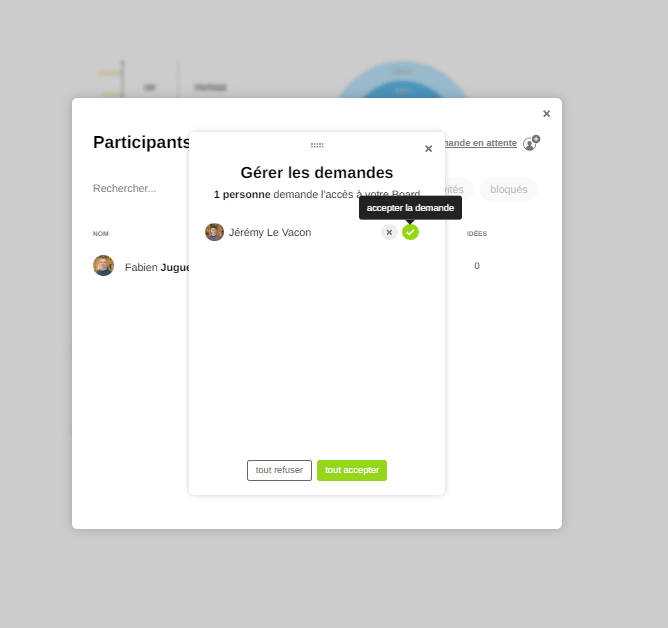 À partir de la notification reçue, les animateurs et co-animateurs peuvent ouvrir une fenêtre dédiée qui affiche l'ensemble des demandes en attente.