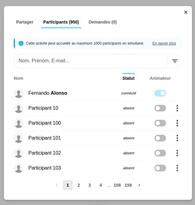 Auparavant, lorsqu'une Activité était partagée depuis un compte PRO Entreprise, seulement 300 participants pouvaient y prendre part en simultanée . Cette limite a été considérablement repoussée, permettant d'accueillir jusqu'à 1000 participants en même temps !