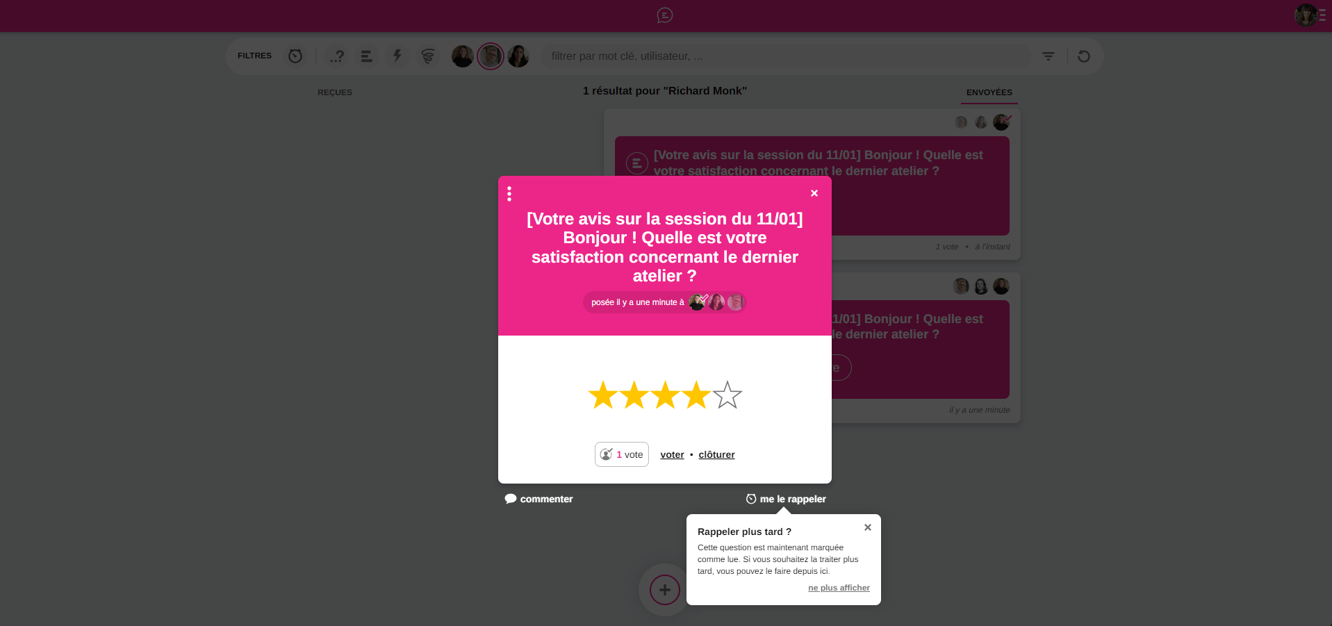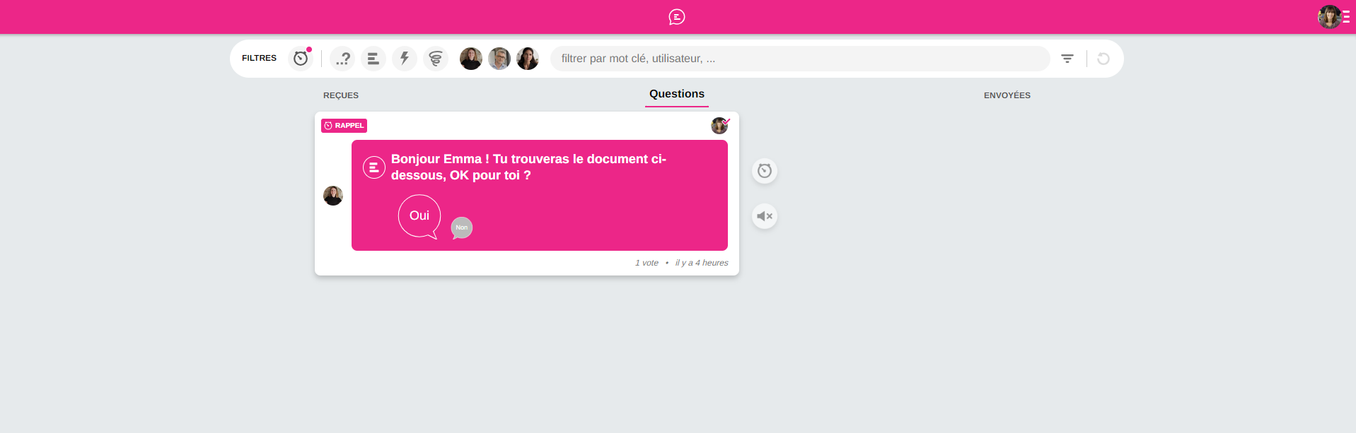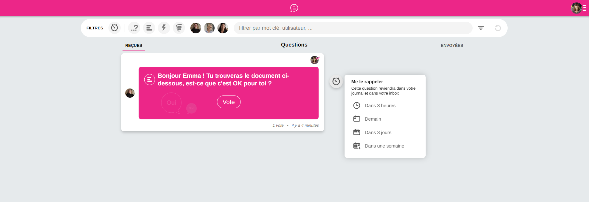Une fois le rappel arrivé à échéance, la Question revient dans votre Inbox avec un encart rose "Rappel".