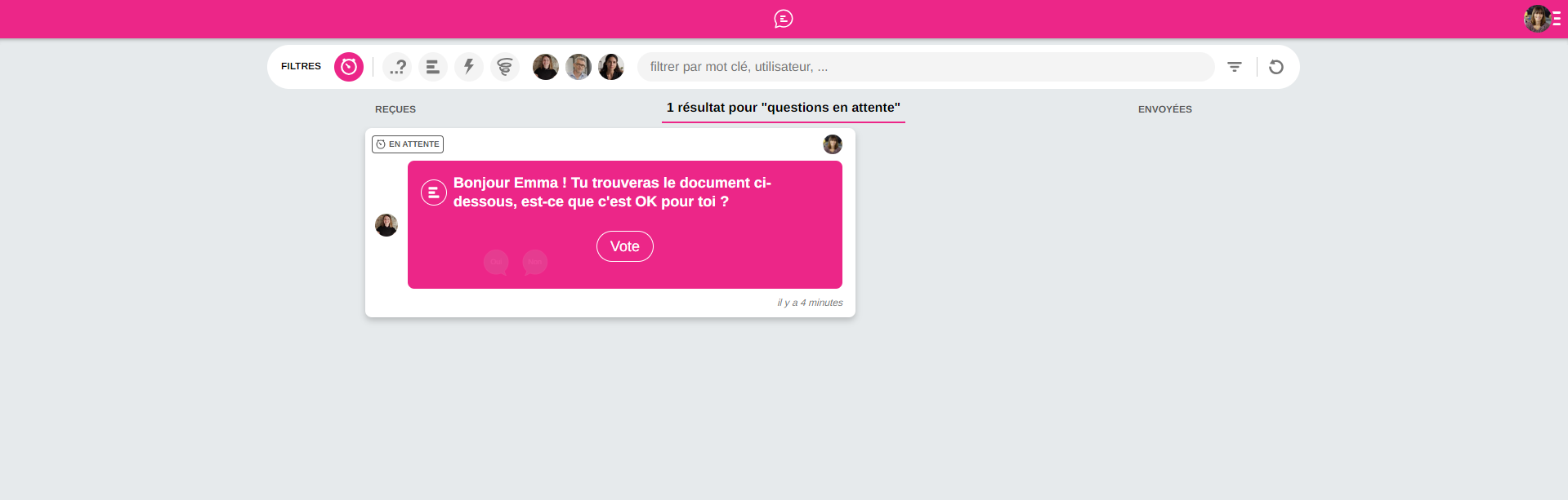 Retrouvez toutes les Questions mises en attente en cliquant sur l'icône dédiée dans la barre de filtres.