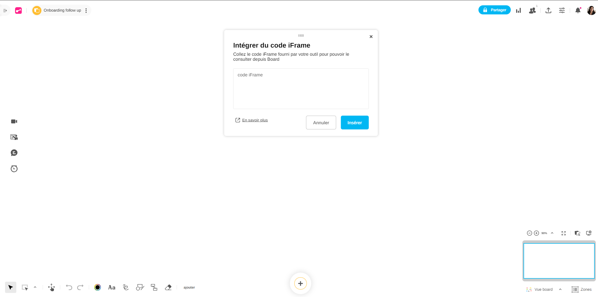 Dorénavant, vous pourrez intégrer du code iFrame dans votre Board afin d'ouvrir et de consulter différents types de page et de document. Avec cette nouvelle fonctionnalité de Board, gagnez en efficacité et en fluidité ! Plus besoin de jongler entre les pages, toutes vos ressources sont désormais accessibles en un seul endroit.