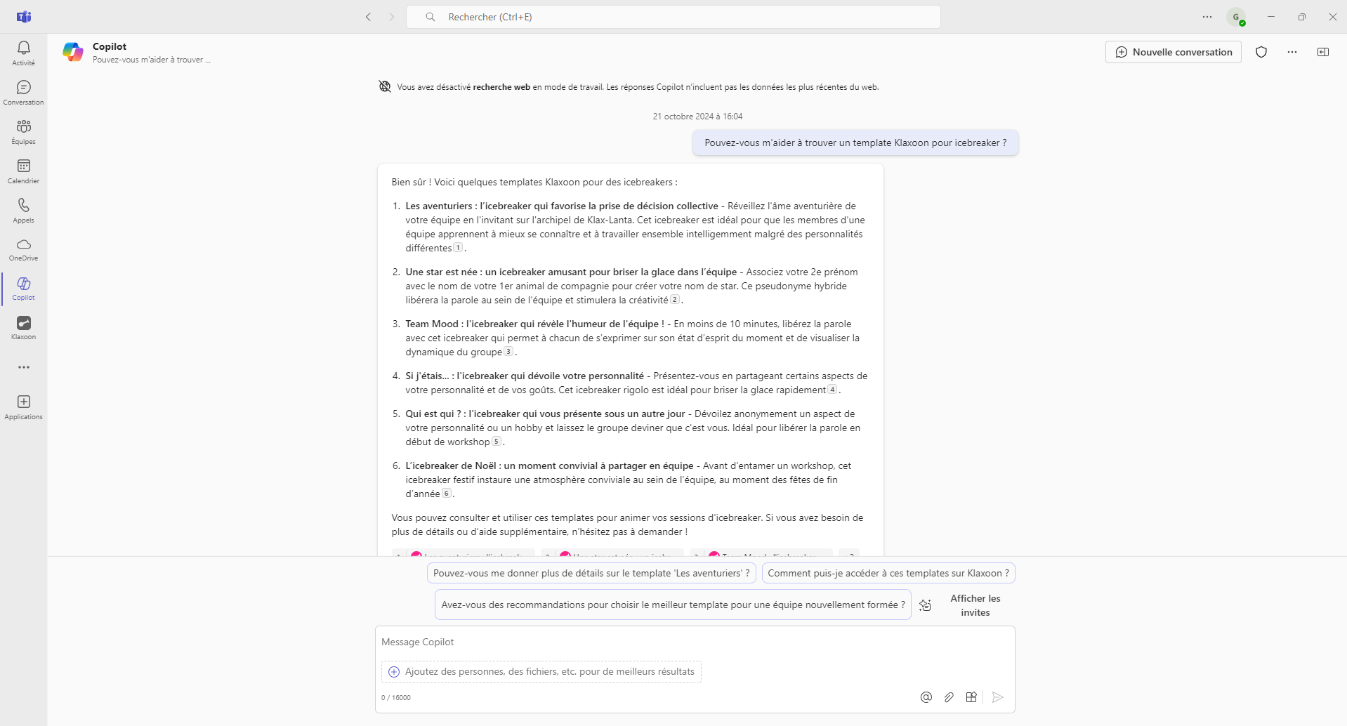 Vous pouvez désormais effectuer vos recherches concernant Klaxoon directement depuis l'IA. Pour répondre à vos questions, Copilot peut vous fournir une liste allant jusqu'à 10 éléments maximum, chaque réponse étant accompagnée d'un lien renvoyant directement sur ce que vous recherchez.