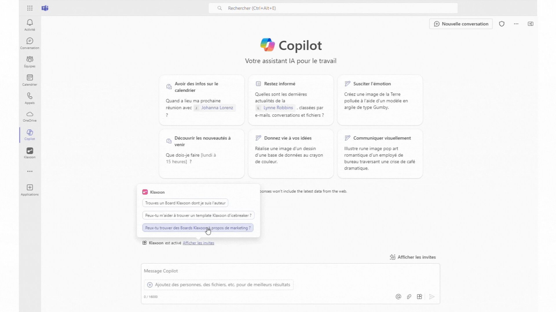 Après l'intégration complète de Klaxoon dans Microsoft 365, que ce soit via l'application personnelle ou en ajoutant vos activités dans un chat ou un email, une nouvelle étape est franchie : Klaxoon est maintenant intégré à l'IA Copilot !