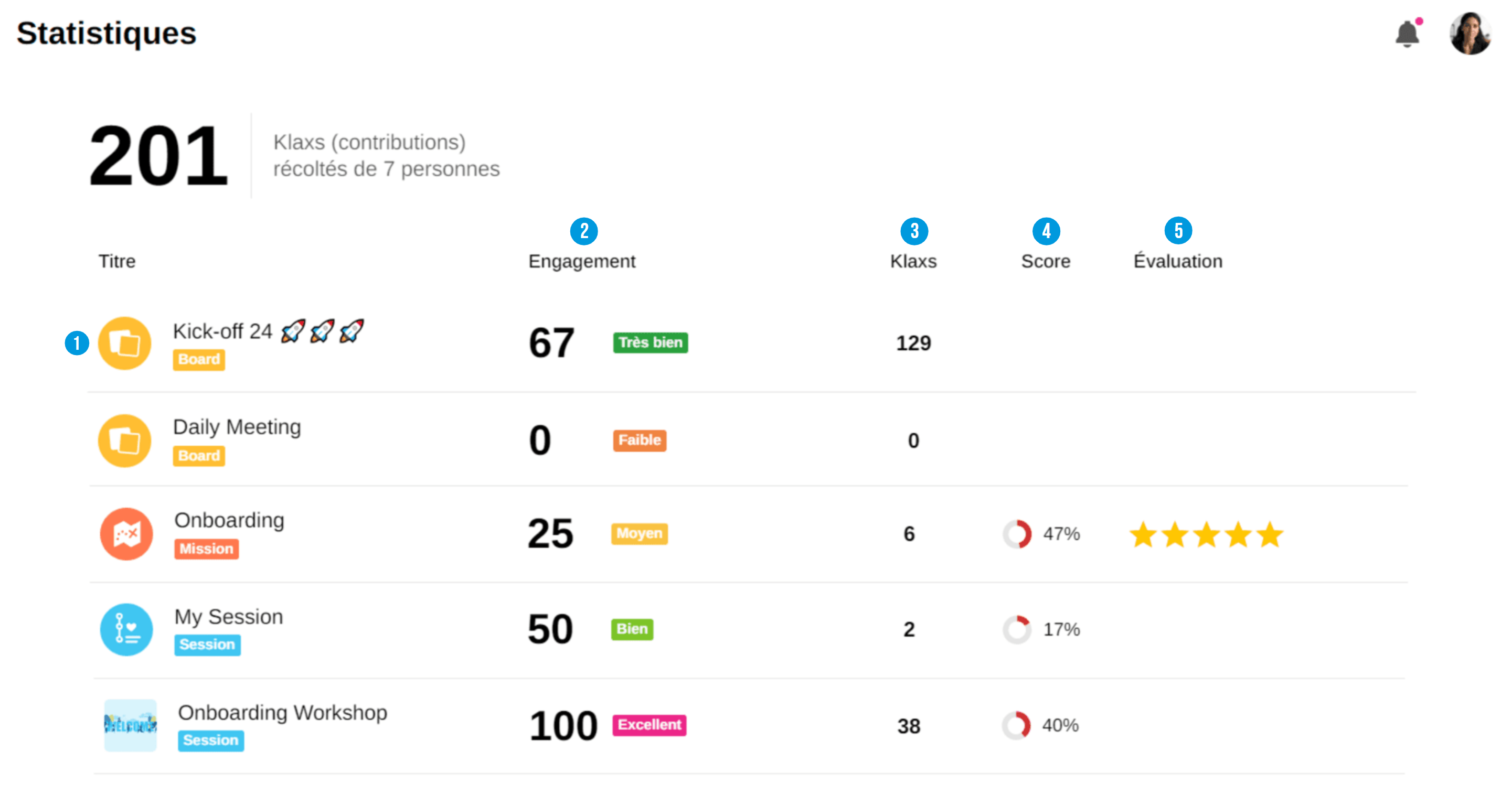 Cette fonctionnalité est disponible depuis le 26 aout 2024 pour tous les utilisateurs de Klaxoon. Si vous souhaitez en savoir plus sur le mode de calcul des Statistiques, vous pouvez également lire cet article : Comment sont calculées les Statistiques ? Vous pouvez également contacter notre équipe Support afin qu'ils puissent répondre à vos questions