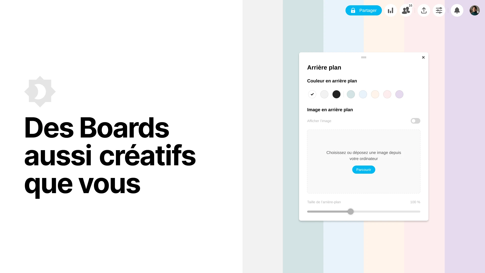 Jusqu’à présent, personnaliser l’arrière-plan de votre Board se limitait à deux options : blanc ou noir. Aujourd’hui, place à bien plus de créativité et de liberté grâce à l’arrivée de six nouvelles couleurs de fond :