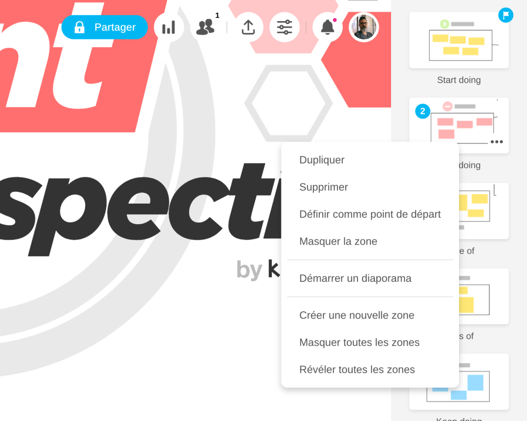Un clic droit sur une Zone ouvre désormais un menu rapide regroupant toutes les actions essentielles (masquer, révéler, dupliquer, supprimer, définir comme point de départ, lancer un diaporama ou créer une nouvelle Zone). Il est aussi possible de masquer ou révéler toutes les Zones d’un seul clic, simplifiant et rendant l’organisation sur Board plus intuitive et agréable.