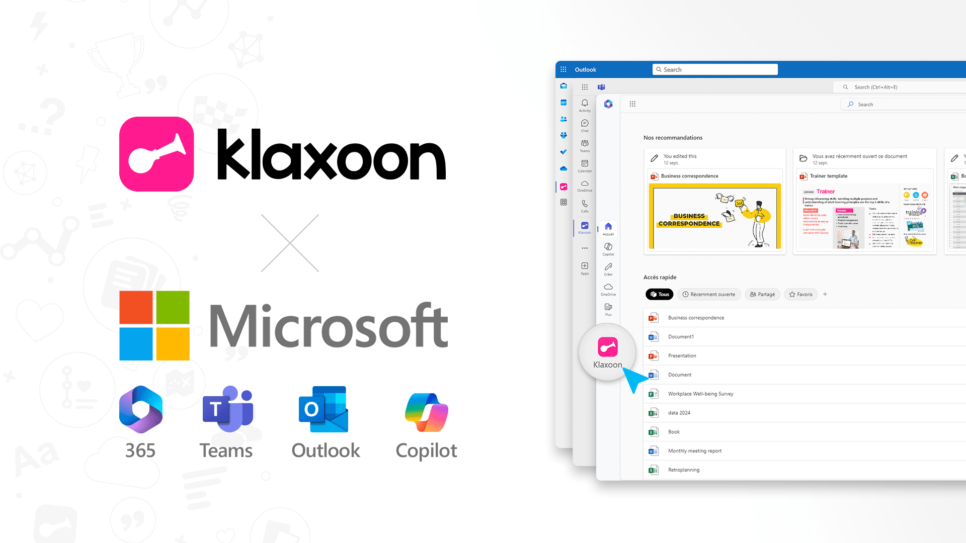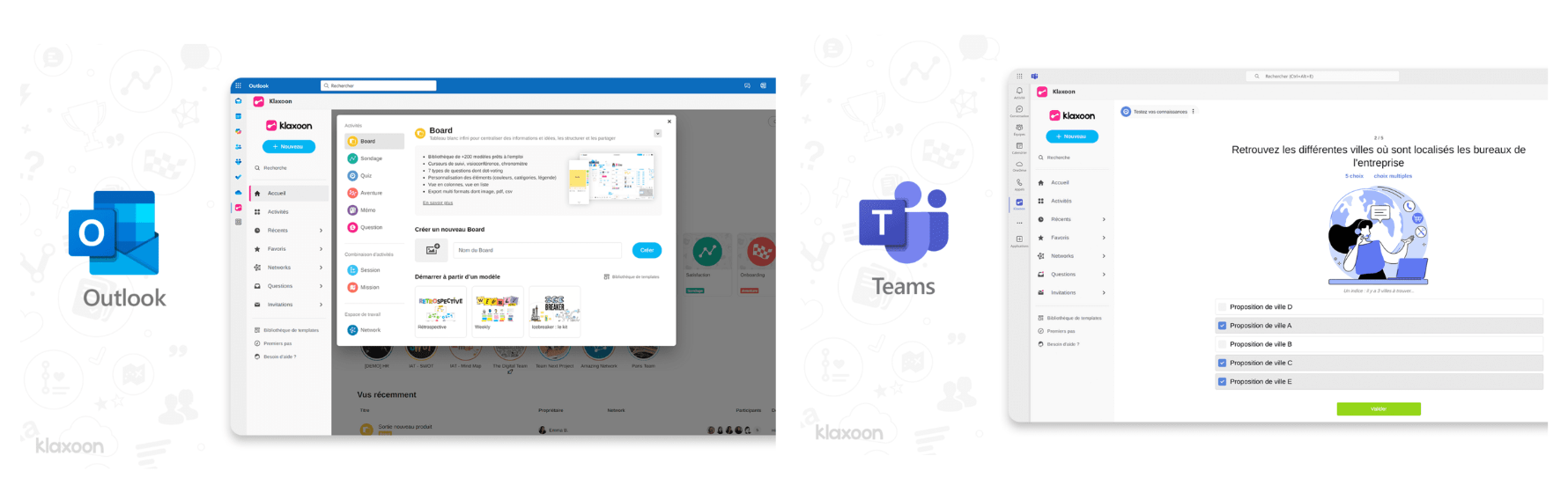 Que ce soit en utilisant Klaxoon dans Outlook pour consulter vos mails et suivre vos activités, ou dans Teams pour retrouver l'ensemble de vos travaux, l'intégration s'étend également à l'ensemble de Microsoft 365.