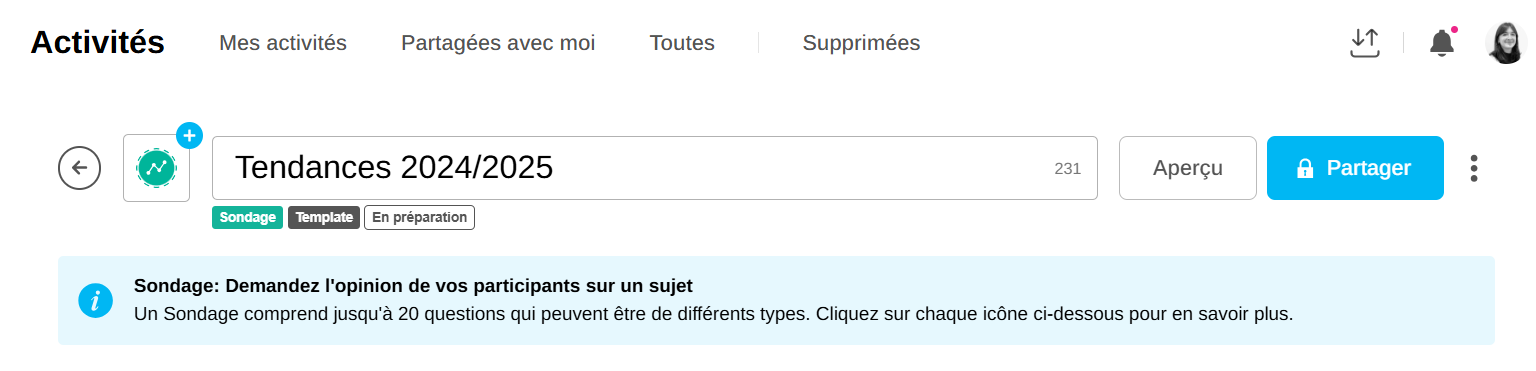 Le type d'activité : identifiez facilement l’activité en cours de création.