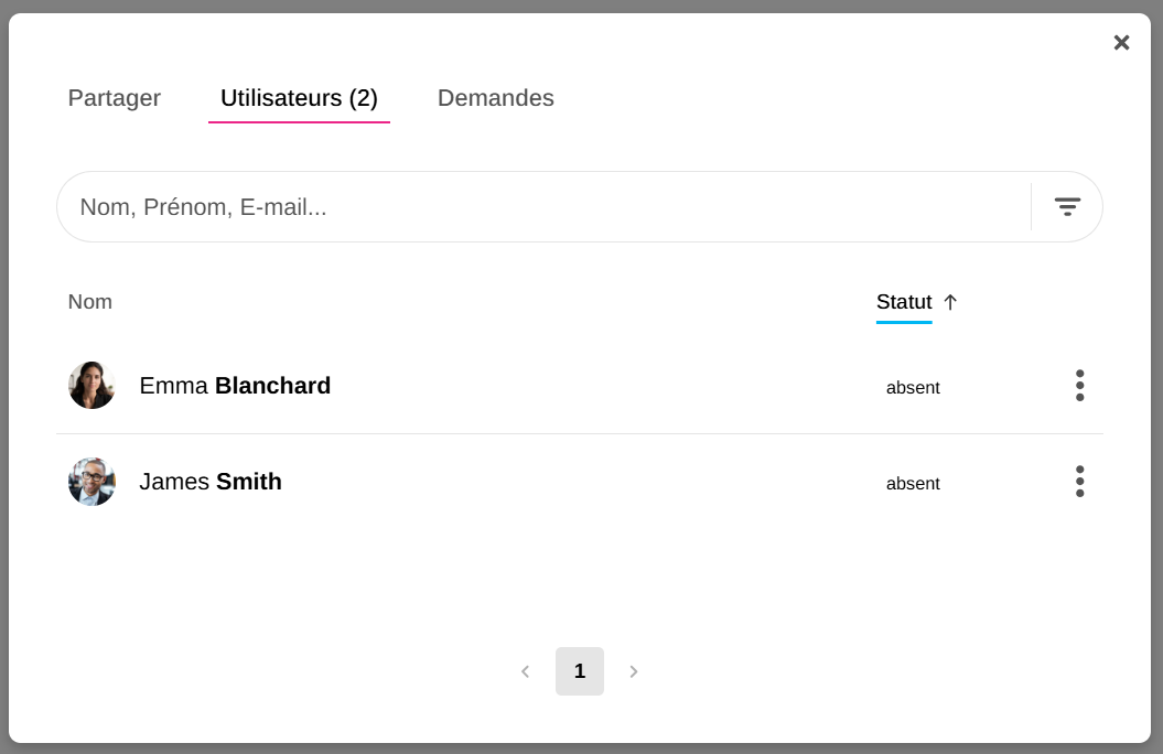 Un nouvel indicateur est désormais disponible dans la fenêtre de partage. Dans l'onglet "Utilisateurs", vous pouvez désormais voir quels participants consultent ou utilisent activement le template.