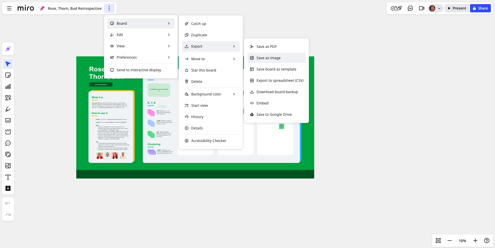Depuis Miro, cliquez sur le menu "3 petits points", puis "Board", "Export" et enfin "Save as image".