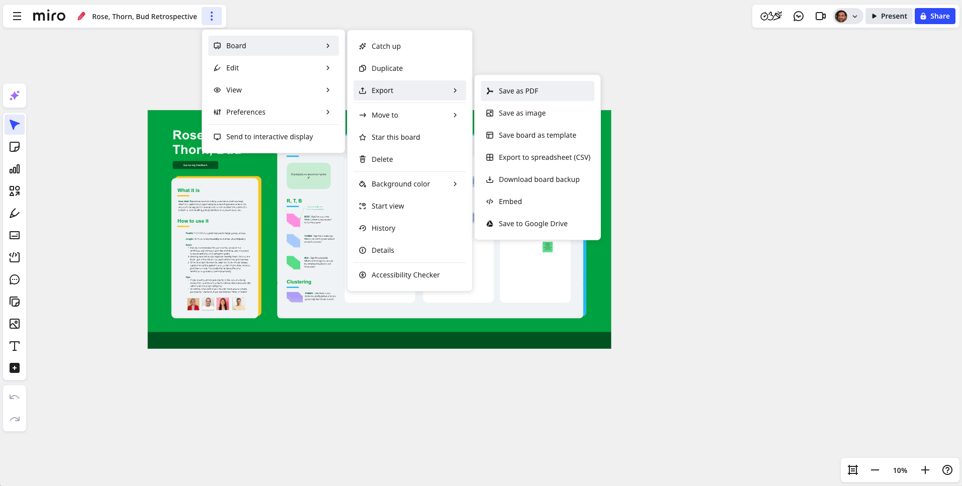 Depuis Miro, cliquez sur le menu "3 petits points", puis "Board", "Export" et enfin "Save as PDF".