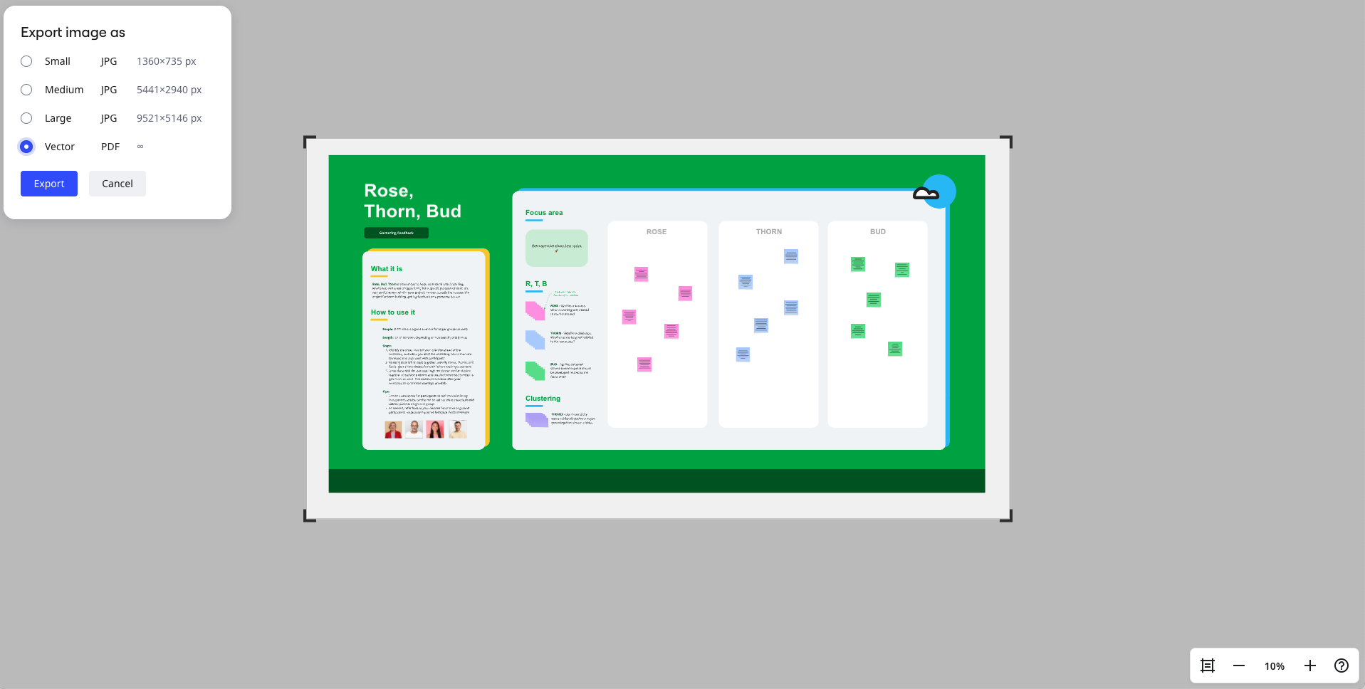 Sélectionnez une zone du Board (frame, éléments, etc.). Le PDF d'une page conserve une qualité vectorielle, permettant un zoom sans perte.