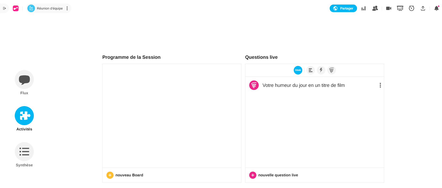 Créez une question , ici une question de type "Storm", sur le Board via l'icône "Solliciter votre équipe".