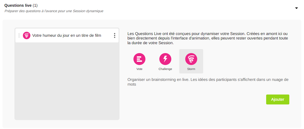 Dans l'espace "Questions live", créez une question de votre choix, ici de type "Storm".