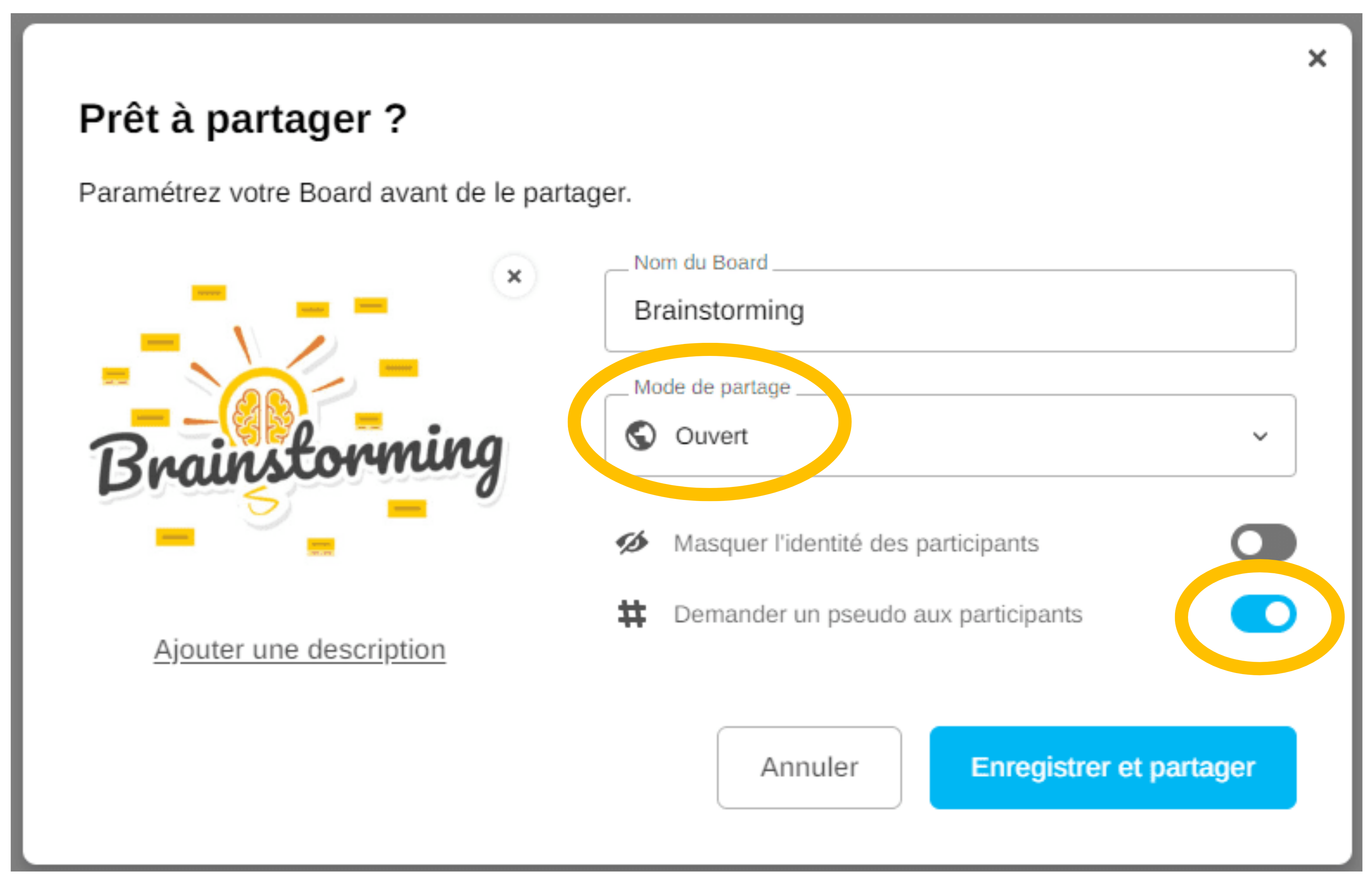 Partagez votre Board en cochant l'option "Demander un pseudo aux participants" et en choisissant le mode de partage "Ouvert aux utilisateurs disposant du lien".