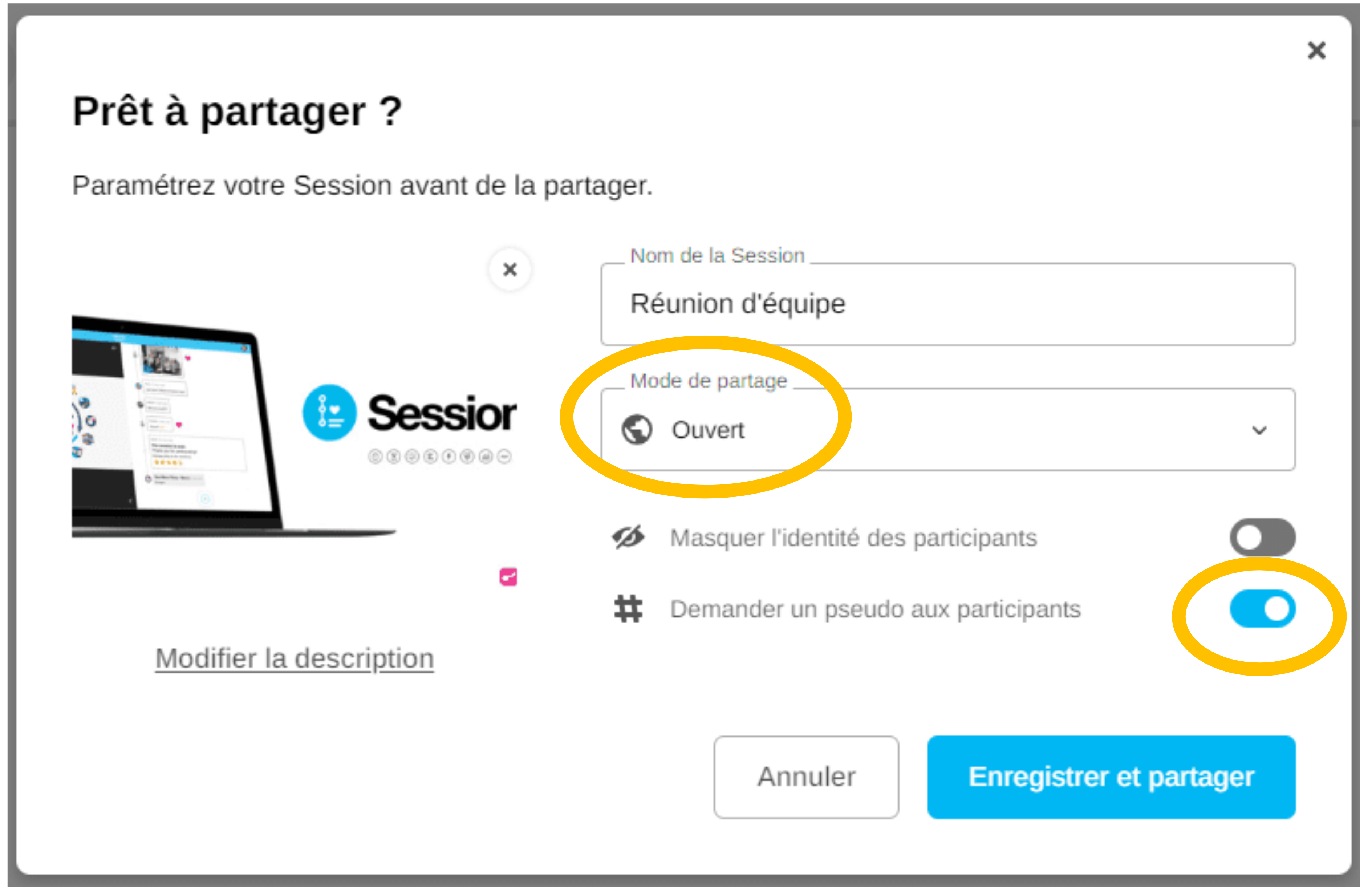 Partagez votre Session en cochant l'option "Demander un pseudo aux participants" et en choisissant le mode de partage "Ouvert aux utilisateurs disposant du lien".