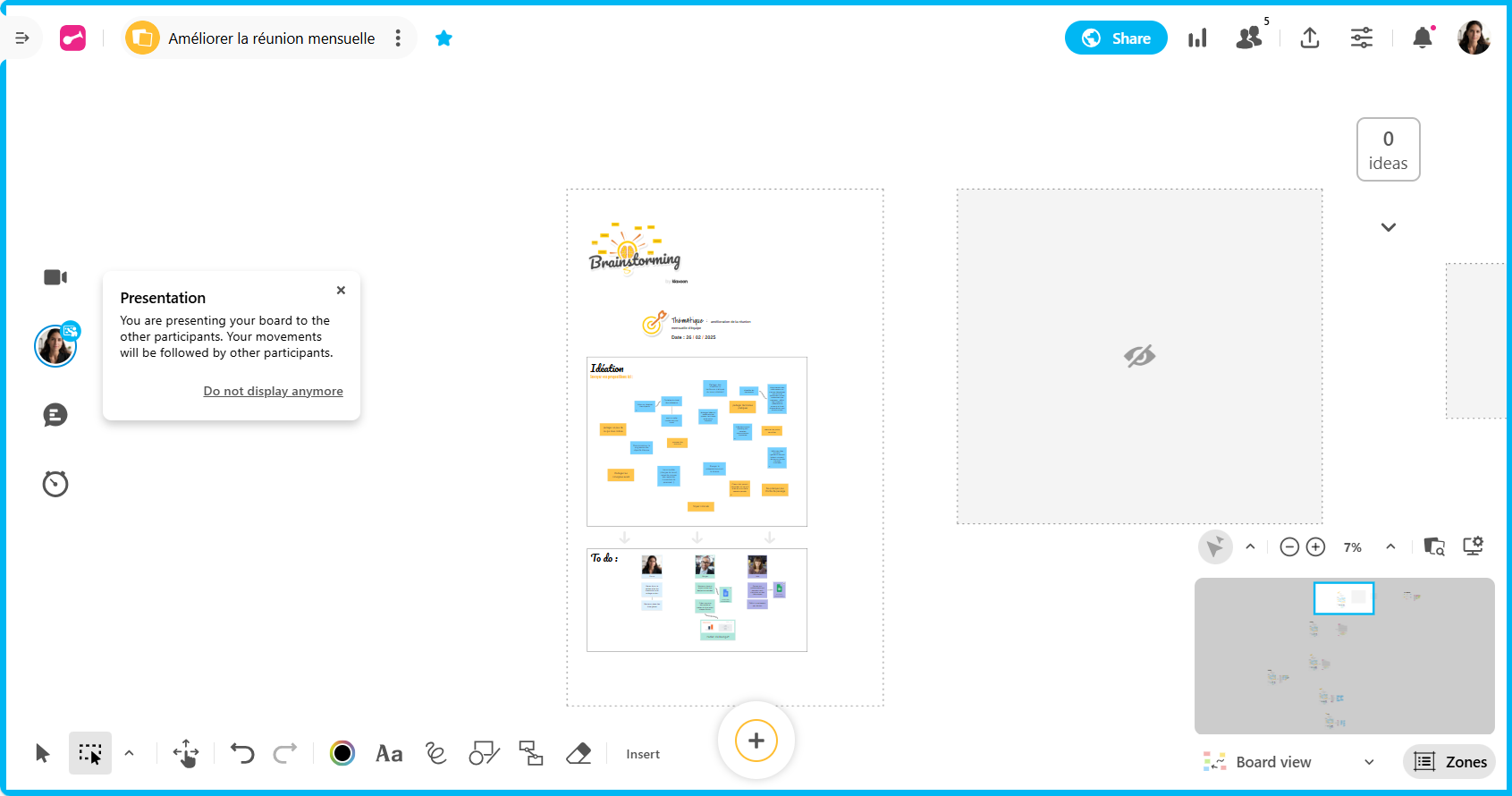 Idéal pour : Des présentations très cadrées, des visites guidées de Boards complexes, et lorsque vous voulez éviter que les participants n'explorent le Board de leur côté.