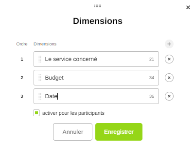 Cochez la case « activer pour les participants » pour que les participants puissent accéder aux dimensions.