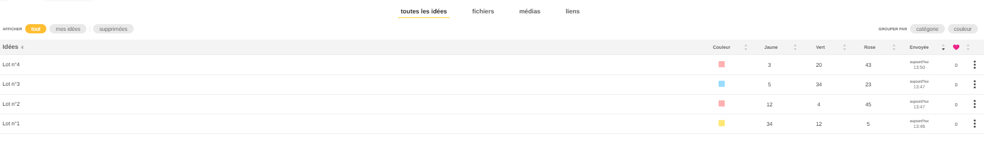 La vue Liste vous permet de trier les idées selon différents critères (couleurs, catégories, dimensions, etc.), tous visibles dans un tableau.