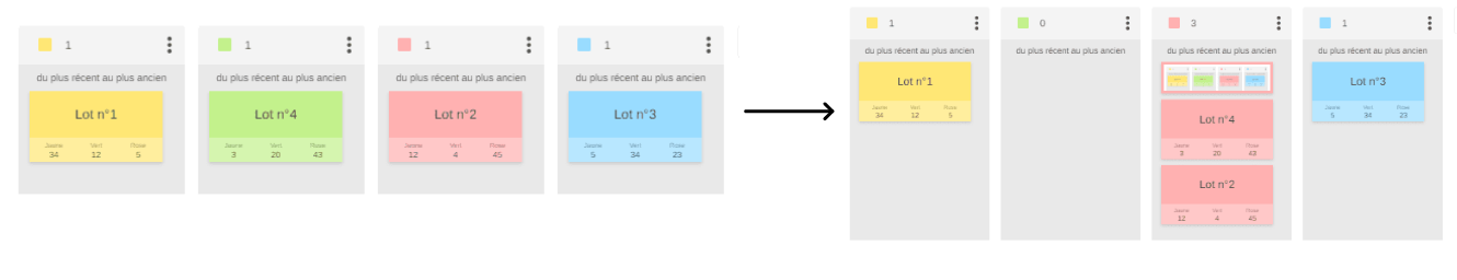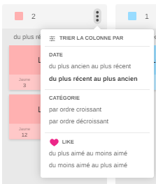 Cliquez sur le menu « 3 points » d'une colonne pour modifier le tri (par date, par catégorie, par type).