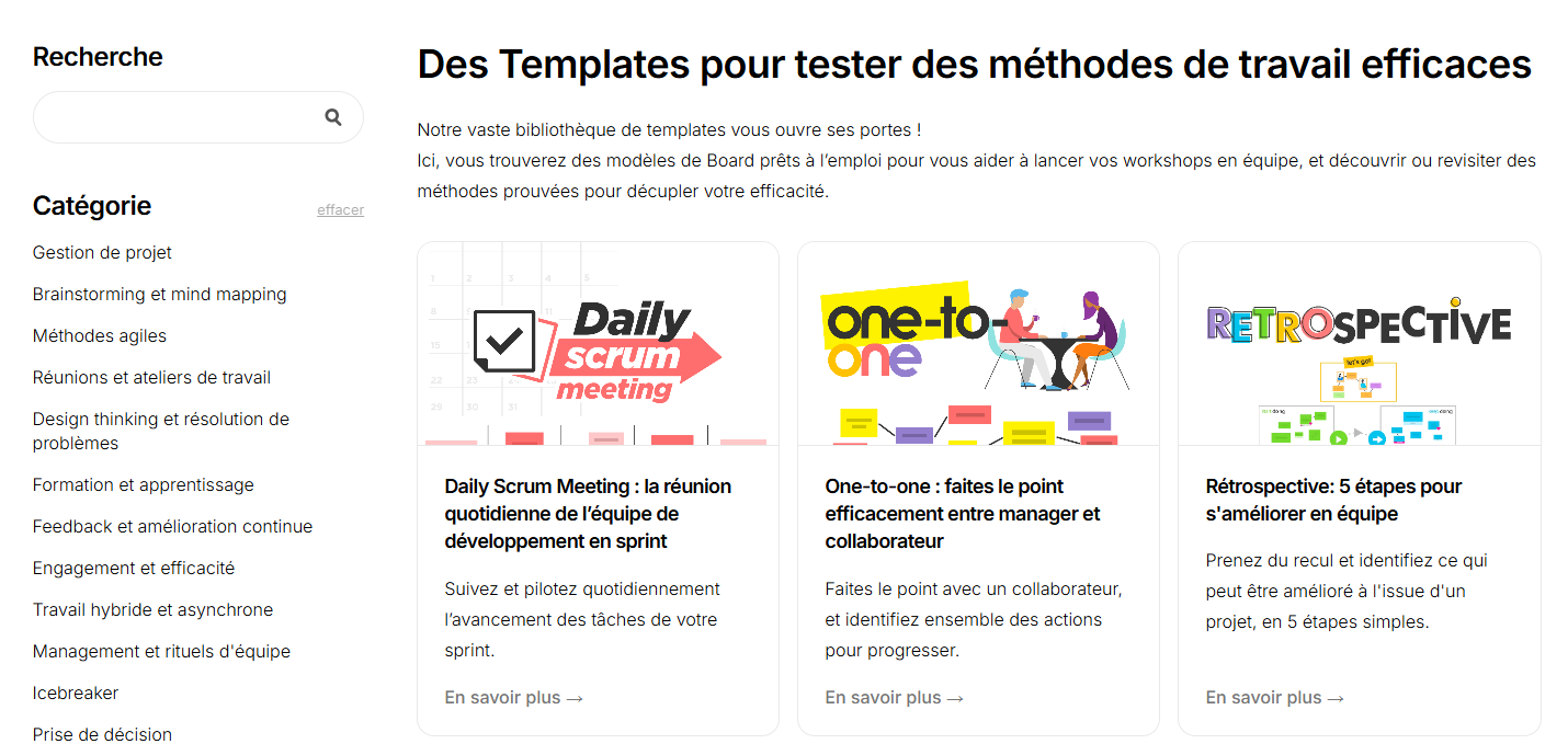 Rétrospective : Utilisez des zones pour "Ce qui s'est bien passé", "Ce qui peut être amélioré", "Actions à prendre".