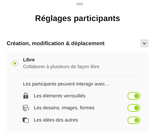 Par défaut, le mode libre est activé, les participants sont libres et peuvent interagir avec des éléments verrouillés, des dessins, des images, des formes ou des idées d’autres personnes.