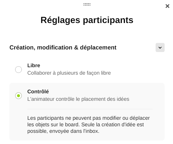 Le mode contrôlé permet uniquement à l’animateur de contrôler le placement des idées.