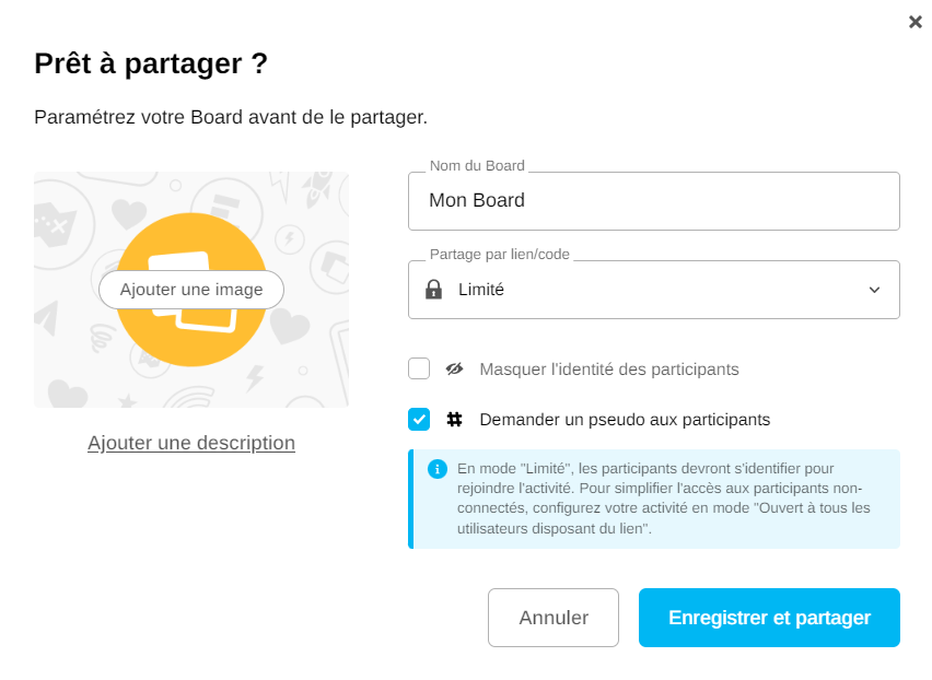 Tout d’abord, vous pouvez nommer le Board et définir le niveau d’accès à l’activité.